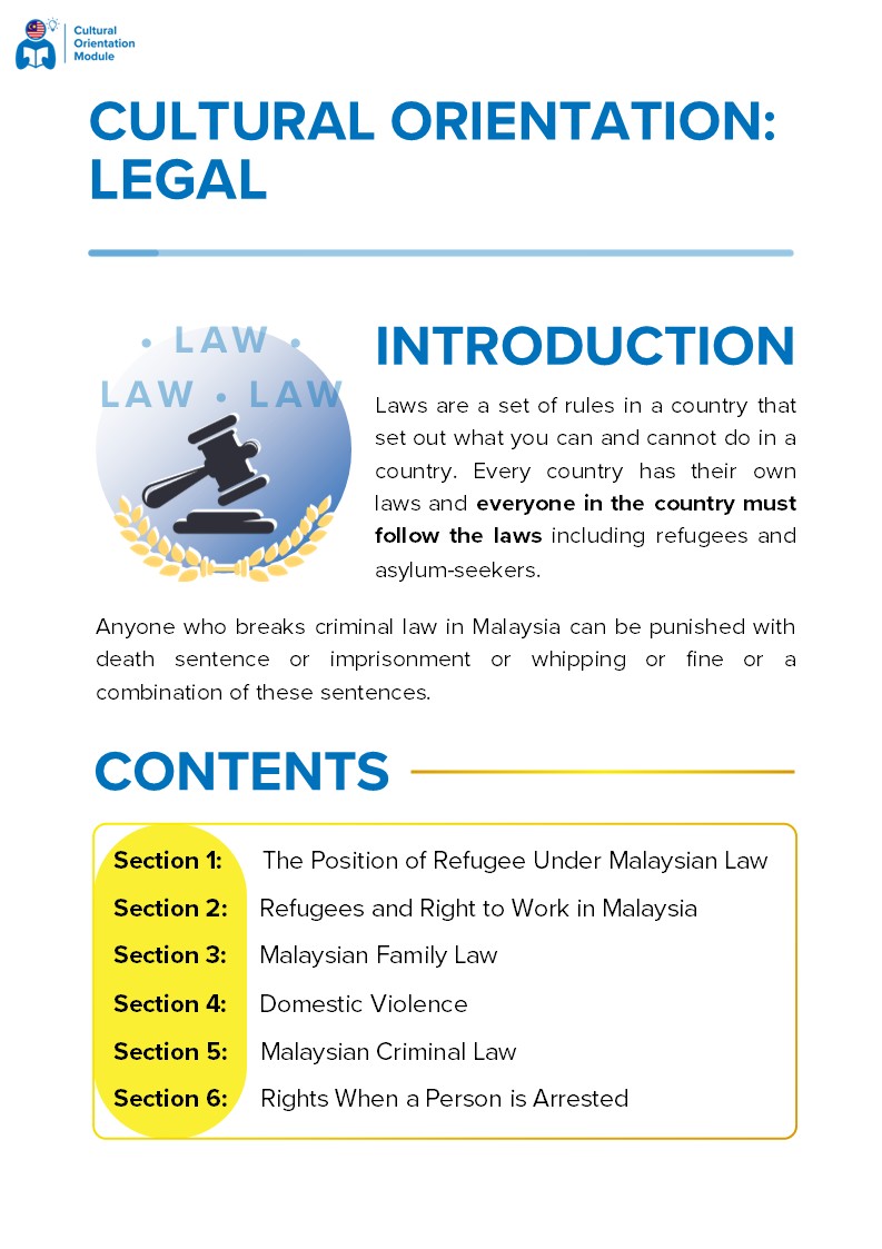 قامت المفوضية السامية للأمم المتحدة لشؤون اللاجئين في ماليزيا بتطوير وحدة التوجيه الثقافي لتوجيه اللاجئين وطالبي اللجوء في فهم الثقافة والعادات والقانون الماليزي. وتغطي هذه الوحدة المعلومات الأساسية الضرورية والملائمة للاجئين وطالبي اللجوء. هناك 9 مواضيع تم تطويرها بالفعل مع موارد إضافية لتوجيه المُيسِّرين. تم تطوير بعض الوحدات بالتعاون مع شركاء المفوضية السامية للأمم المتحدة لشؤون اللاجئين والمنظمات غير الحكومية والمؤسسات الأكاديمية وأصحاب المصلحة الآخرين في ماليزيا. المحتوى لجميع المواضيع مناسب لجميع اللاجئين في ماليزيا، حيث تتضمن شرائح كل مقدم العرض ملاحظات لتوجيه المقدم.