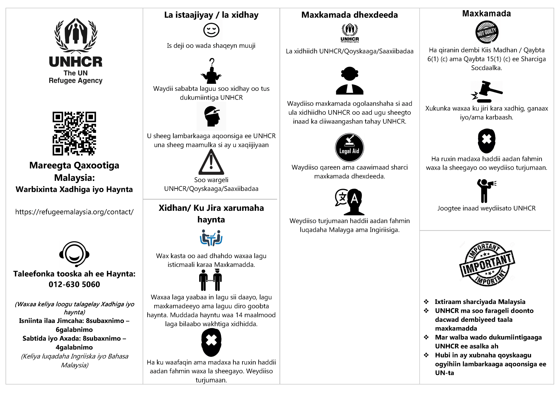 Si loo wanaajiyo helitaanka qaxootiga ee caddaaladda, UNHCR oo ay weheliso Xarunta Kaalmada Sharciga ee Kuala Lumpur,waxay abuureen taxane muuqaallo wacyigelin sharci ah si ay kaaga caawiyaan inaad si fiican u fahamto xuquuqdaada iyo mas’uuliyaddaada Malaysia. Fiidiyowyadan xog-ogaalka ah waxay ka hadlayaan dhowr arrimood oo sharci oo muhiim ah waxayna ka hadlayaan su’aalaha sharci ee inta badan la weydiiyo qaxootiga iyo magangalyo-doonka Malaysia.