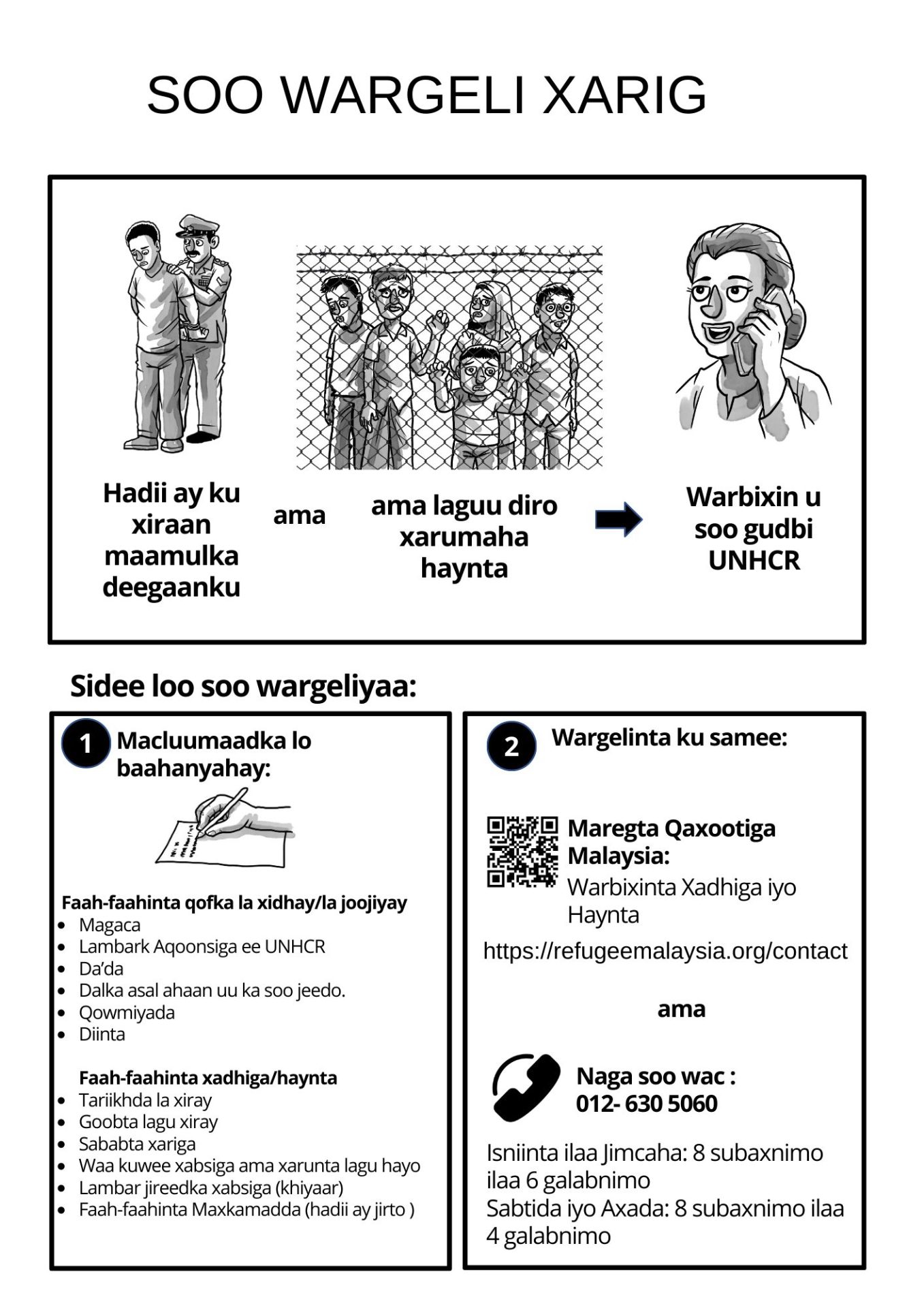 UNHCR waxay la socotaa dhammaan warbixinnada xidhitaanka ee lagu sameeyo khadka telefoonka ee xadhiga iyo xabsiga iyo mareegta qaxootiga Malaysia. UNHCR waxay si degdeg ah u faragelin doontaa hay’adda sharci fulinta ee ay khusayso si ay u caawiso kuwa lagu xiray sharciga socdaalka si looga fogaado in lagu sii hayo ama lagu xukumo. Fadlan ogow in laga yaabo in UNHCR aysan awoodin inay ku caawiso 14-ka maalmood ee ugu horreeya ee xabsiga haddii aysan mas’uuliyiintu si gaar ah uga codsan UNHCR inay xaqiijiso aqoonsiga qofka la xiray.