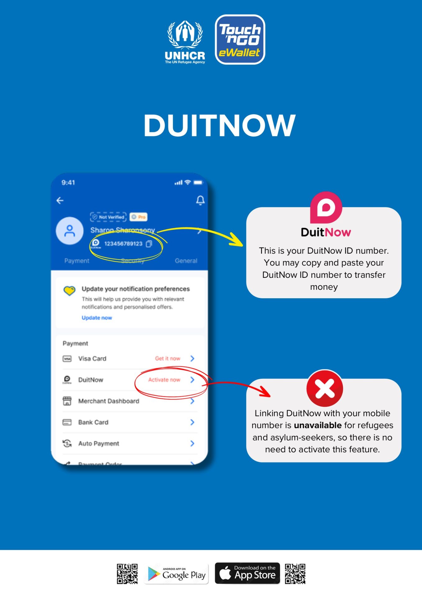 நினைவூட்டல்: TNG eWallet இல் பதிவு செய்யும் போது உங்களின் சொந்த மின்னஞ்சல் முகவரி, முகவரி மற்றும் தொலைபேசி எண் மற்றும் UNHCR ஐடி ஆகியவற்றைப் பயன்படுத்துவதை உறுதிசெய்யவும். பதிவு செயல்பாட்டின் போது UNHCR இன் தொடர்புத் தகவலைப் பயன்படுத்த வேண்டாம்