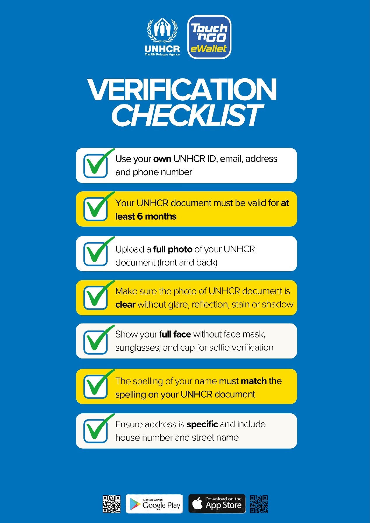- சீரான சரிபார்ப்பு செயல்முறையை உறுதிசெய்ய, கண்ணை கூசும், பிரதிபலிப்பு அல்லது நிழல் இல்லாமல் உங்கள் UNHCR ஆவணத்தின் தெளிவான புகைப்படத்தைப் பதிவேற்றுவதை உறுதிசெய்யவும்.