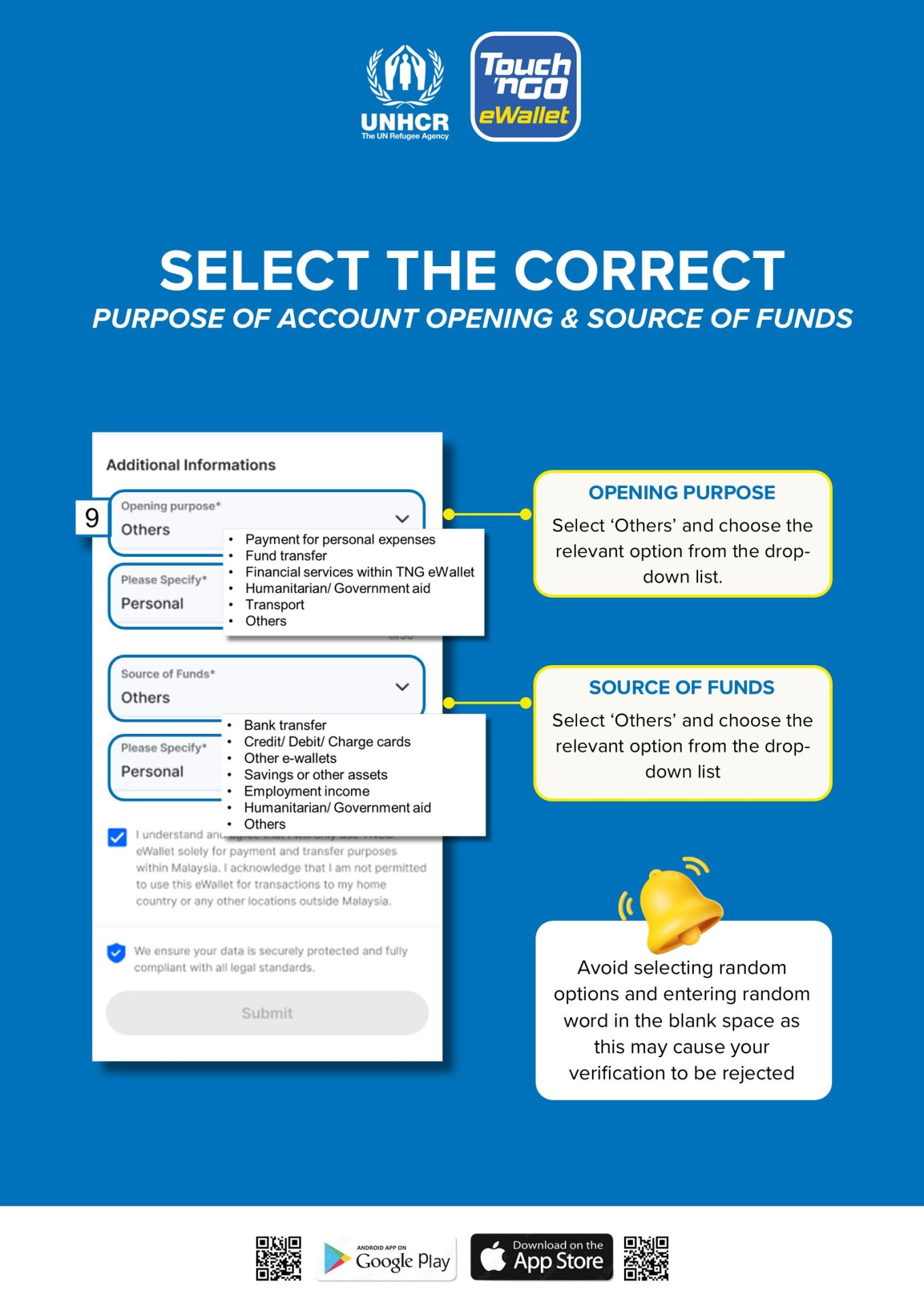 - TNG eWallet இல் பதிவு செய்யும் போது உங்களின் சொந்த மின்னஞ்சல் முகவரி, முகவரி மற்றும் தொலைபேசி எண் மற்றும் UNHCR ஐடி ஆகியவற்றைப் பயன்படுத்துவதை உறுதிசெய்யவும். பதிவு செயல்பாட்டின் போது UNHCR இன் தொடர்புத் தகவல் மற்றும் மின்னஞ்சல் முகவரியைப் பயன்படுத்த வேண்டாம்